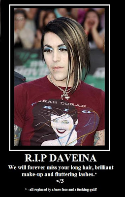 I think I died a bit inside when I saw that Daveina was no more. Btw, he's not actually dead; his beautiful hair, make-up and eyelashes have been replaced for nothing other than a bare face, stubble and a fucking quiff. I mean really, a quiff? We're not living in the 50's anymore Daveina! But then again, there is that whole 50's 'mod' type fashion going around faster than a prostitute spreads chlamydia. Hm, I think he stopped hanging around with Jeffree Star..